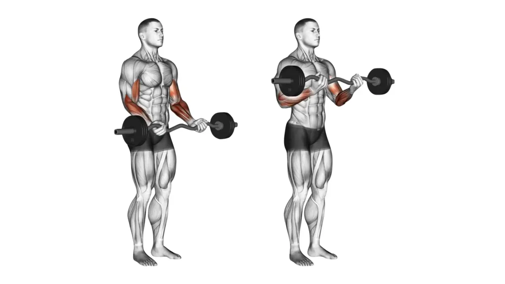 Le curl à la barre EZ est idéal pour développer des biceps saillants tout en réduisant la tension sur les poignets. Les mains prennent une position semi-supinée qui favorise le brachial et le chef court du biceps. Les coudes restent collés au corps pendant tout le mouvement.